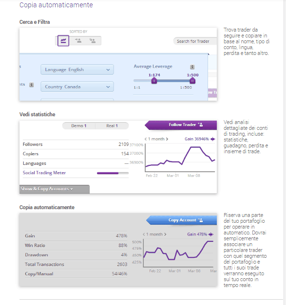 Con la funzione copy trader, è possibile copiare in maniera del tutto automatica, i trader Guru, il cui profilo è visibile nella piattaforma di social trading e dalla quale è possibile copiarne i movimenti e trarne vantaggio.